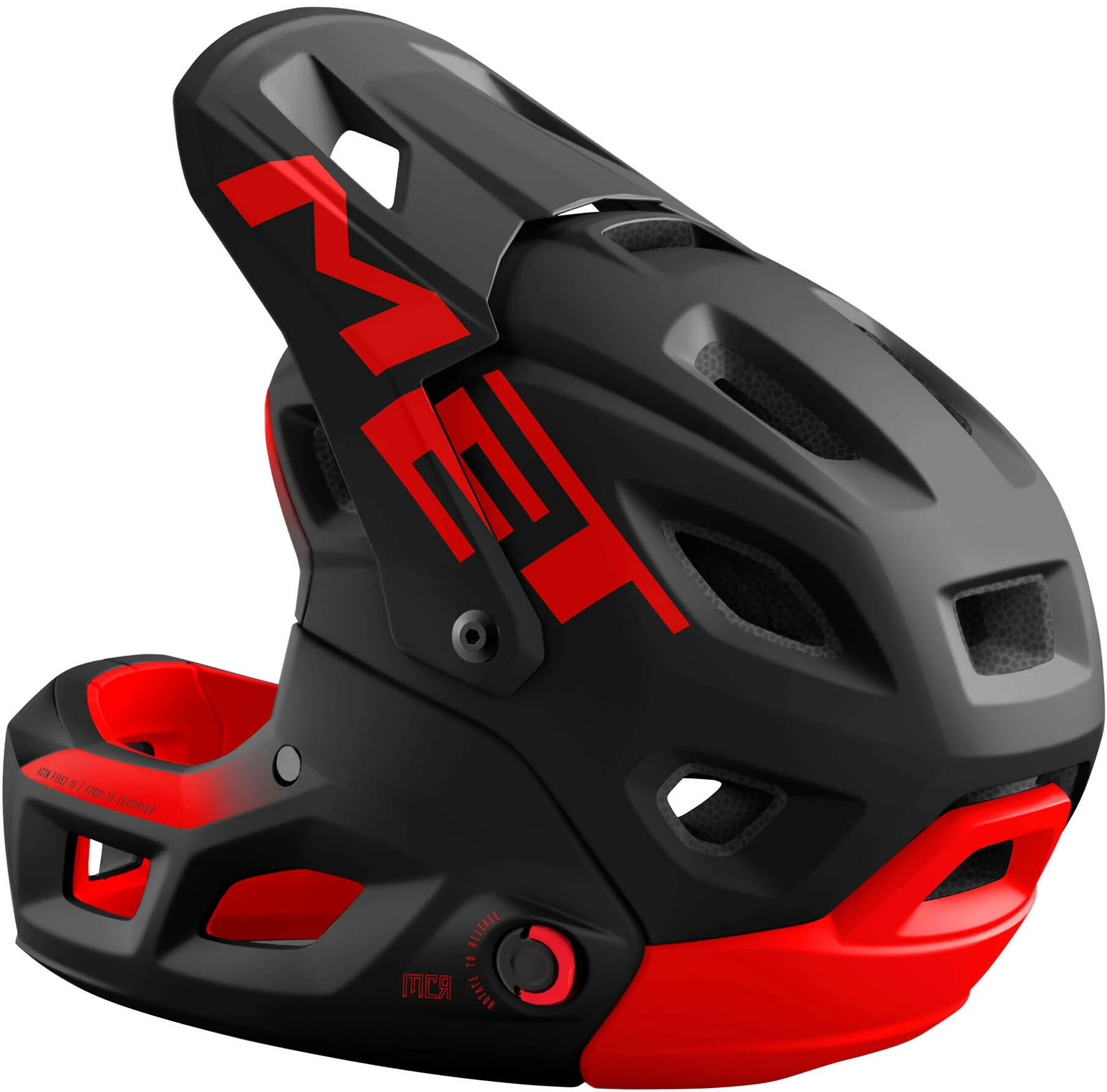 mens halvskallen afspejler designet og den kompakte størrelse af en all-mountain-hjelm. Den magnetiske hagerem forvandler en full face-hjelm til en halvskjold og omvendt på ingen tid. Visiret er fleksibelt og tilpasser sig hjelmskallen i tilfælde af et fald. Denne unikke funktion hjælper effektivt med at minimere rotationskræfterne på halsen.